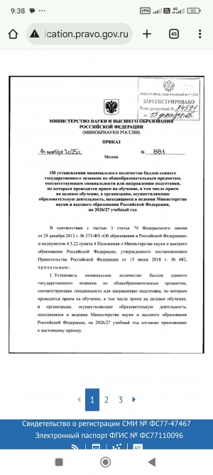 18.12.2025📝 Приказом Министерства науки и высшего образования Российской Федерации от 14.11.2025 № 881 утверждены минимальные баллы ЕГЭ для поступления в вузы, подведомственные Минобрнауки России, на следующий учебный год.