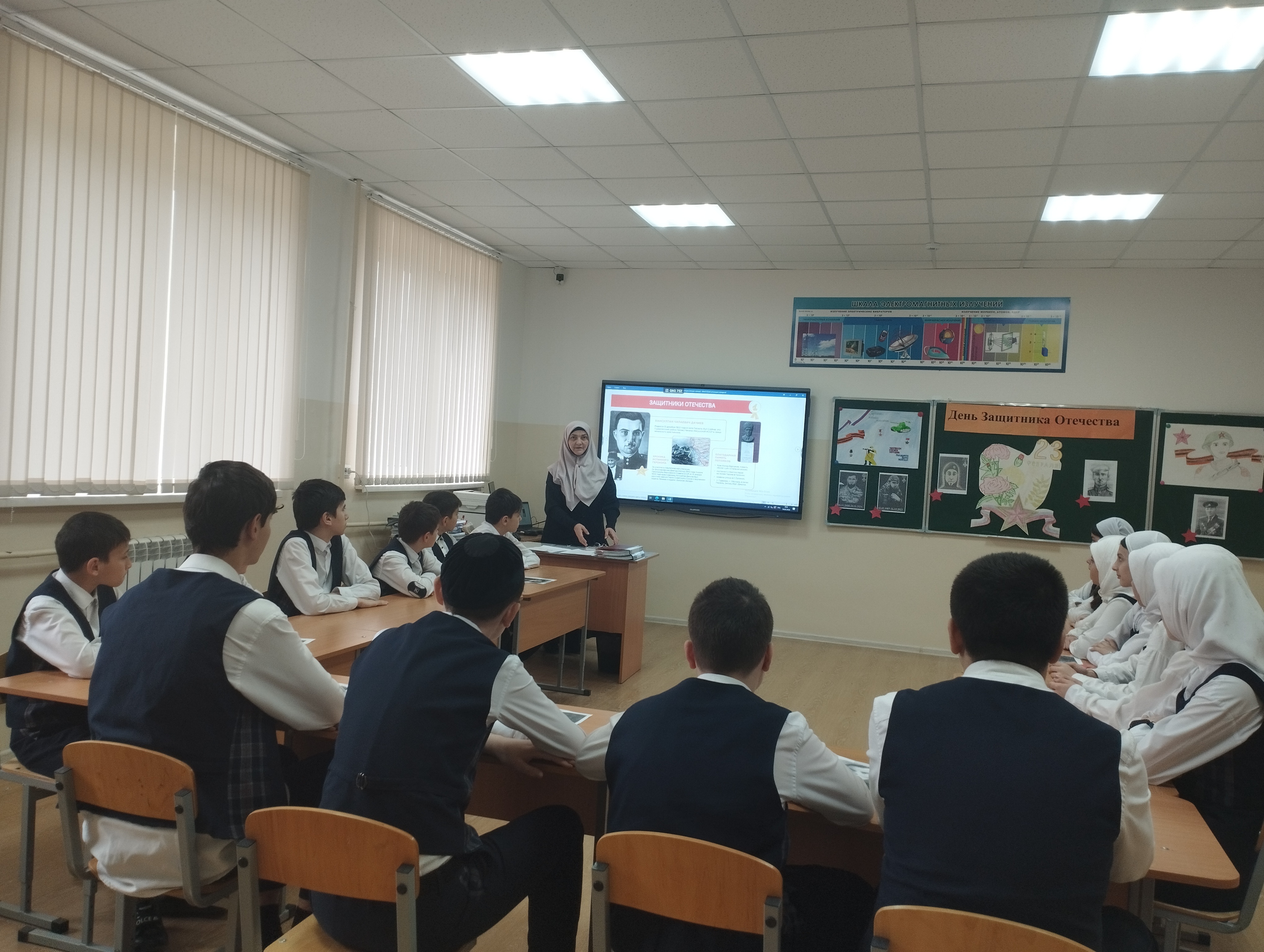 Яха Мовладиевна объяснила значимость Дня защитника Отечества. Рассказала о том, как и когда появился этот праздник. Обсудила роль армии в истории страны. Задавала вопросы учащимся: «Что для вас значит быть защитником Отечества?», «Как можно проявить патриотизм в повседневной жизни?».