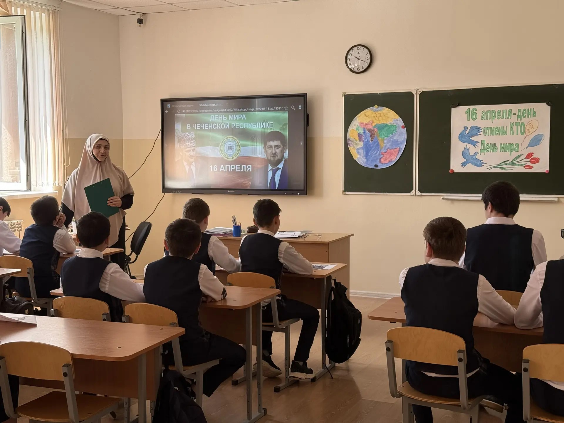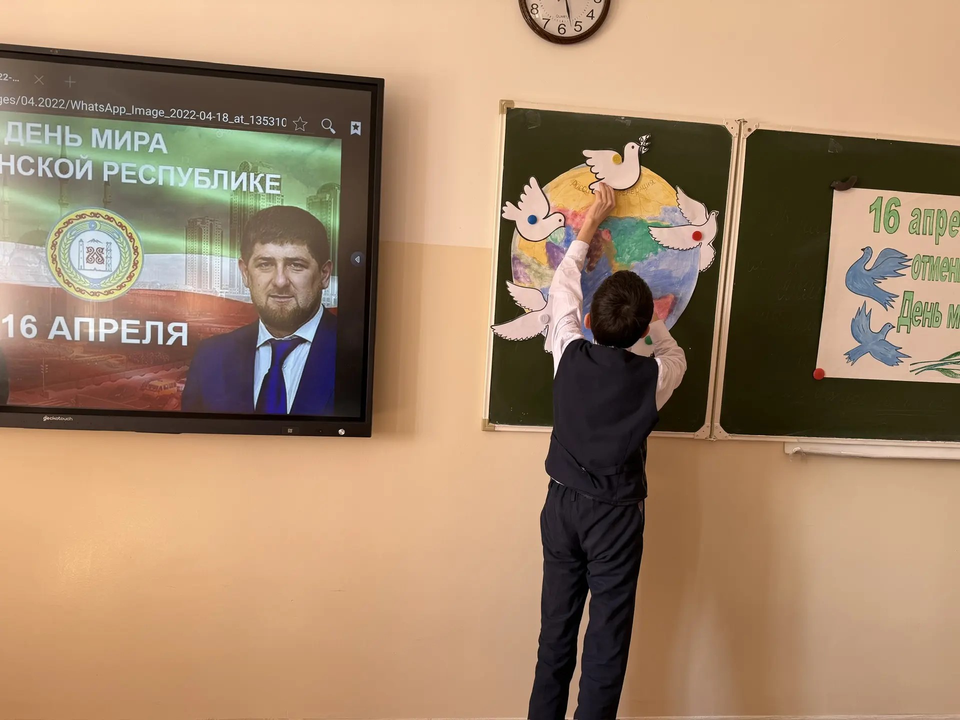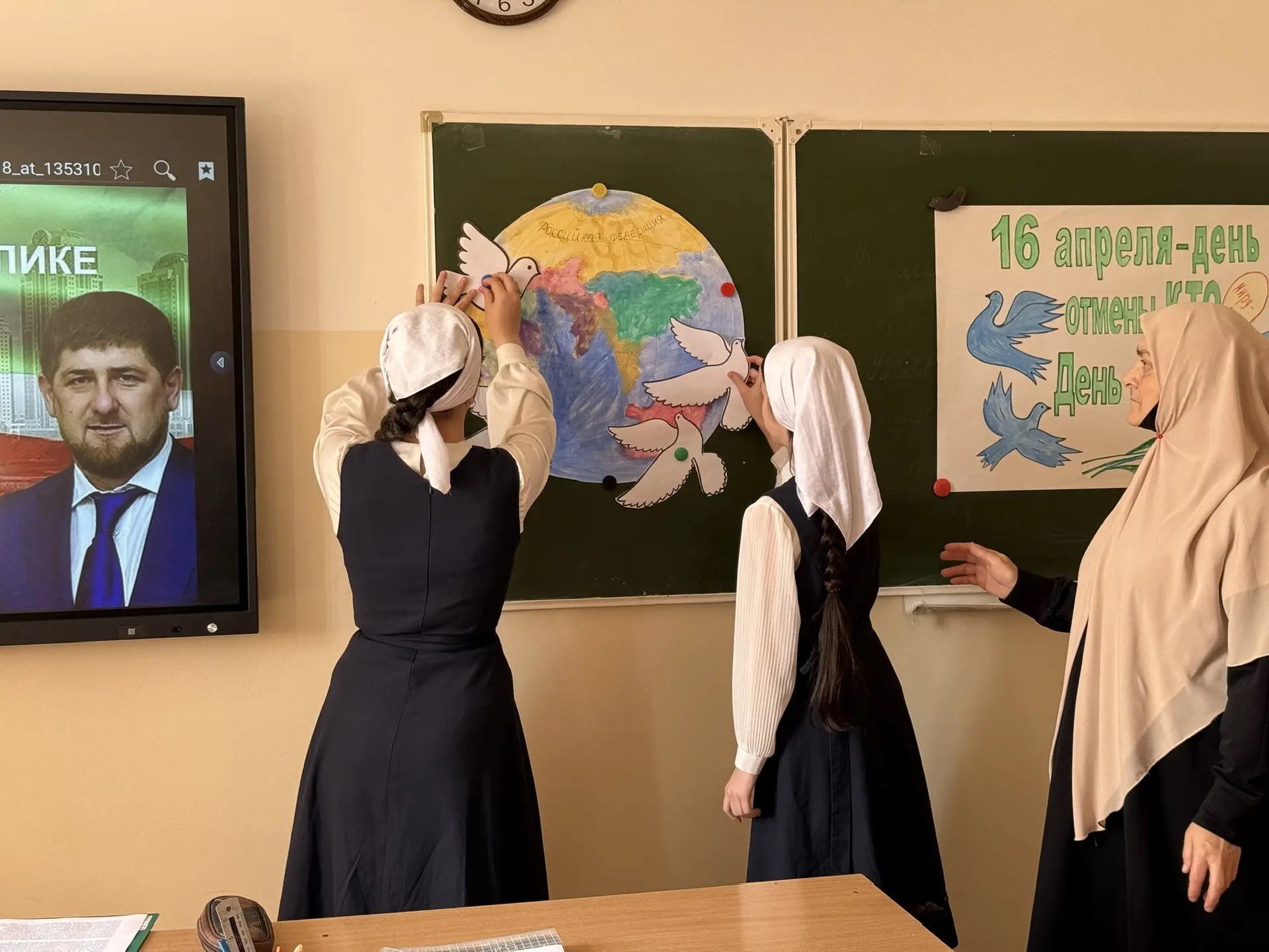 Ученики нарисовали белых голубей как символ мира и прикрепили их к символическому изображению нашей планеты. Это акция является показателем надежд и чаяний всех детей нашем мире. Яха Мовладиевна напомнила учащимся о том, что современный мир очень хрупок и надо прилагать усилия, чтобы жить в мире и согласии, а также ценить то, что есть, уважать традиции и ценности своего народа и быть готовыми трудиться на благо своей Родины.